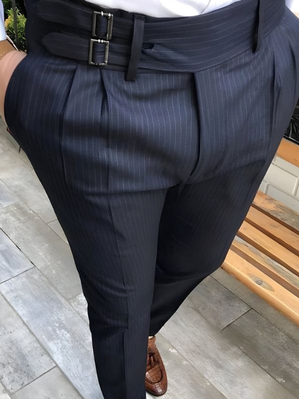 Navy Striped Double Buckle Formal Gurkha Pants by ARVIANO